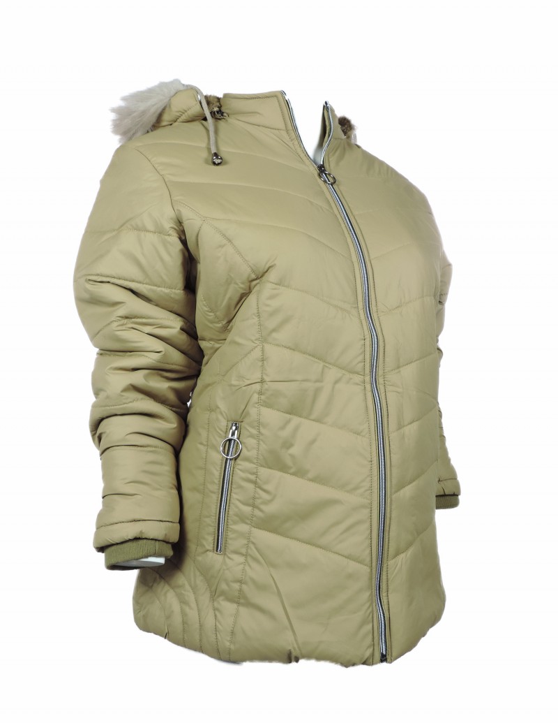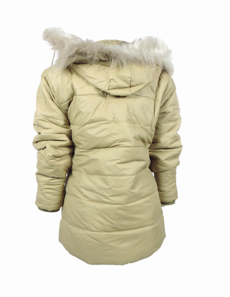Light Brown Parka solid jacket with faux fur detail, has a detachable hood, 2 pockets, zip closure, long sleeves, curved hem, and polyester lining