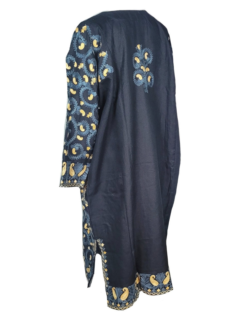 An Aari work pheran is a timeless Kashmiri garment that reflects the region’s rich cultural heritage and skilled craftsmanship. Made from warm, luxurious fabrics such as wool, velvet, or fine blends, this traditional pheran is adorned with intricate hand Aari embroidery. The detailed motifs—often inspired by nature, florals, paisleys, and traditional Kashmiri patterns—are meticulously crafted using fine threads, adding elegance and depth to the attire.