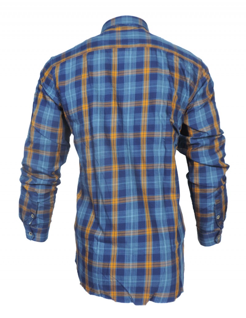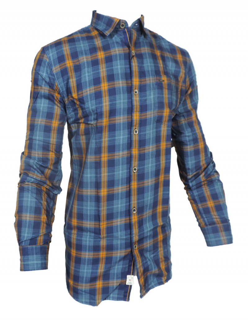 Dark Blue checked casual shirt, has a spread collar, button placket, 1 pocket, long sleeves, curved hem