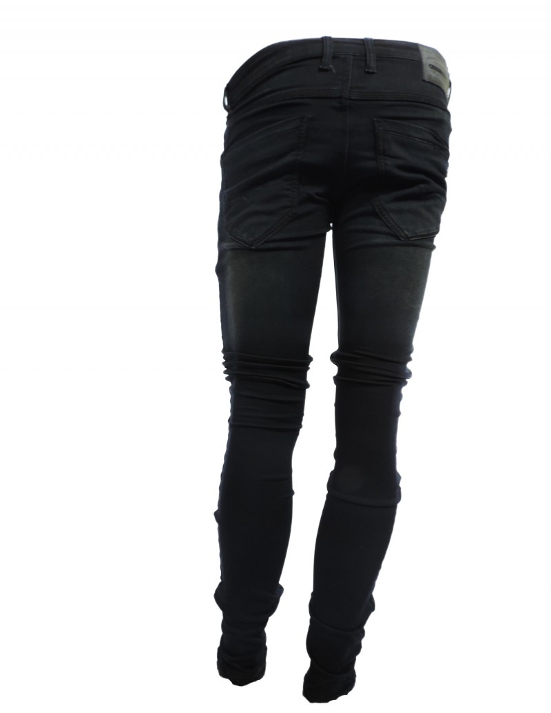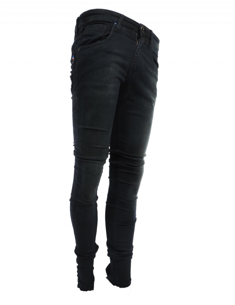 Black Medium wash 5-pocket mid-rise jeans, clean look with light fade, has a button and zip closure, waistband with belt loops