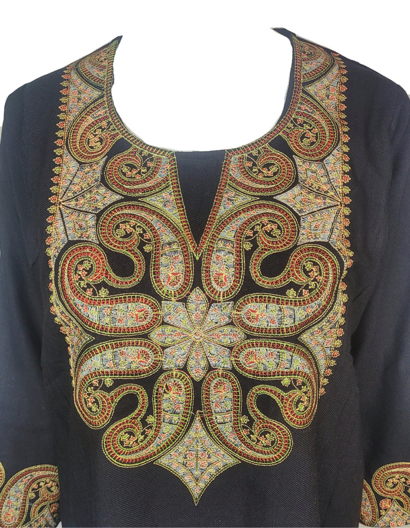 Traditional Kashmiri pheran featuring exquisite hand-done sozni embroidery
